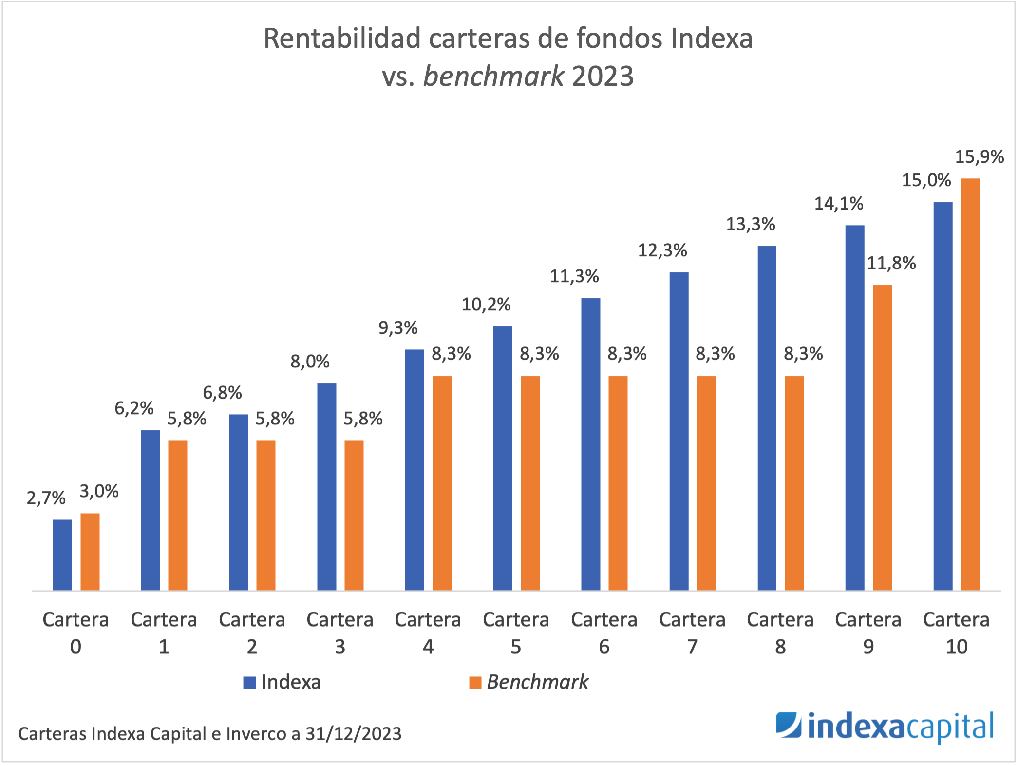Tiempo de lectura: 12 minutos. Como escribíamos en la actualización de rentabilidades del primer semestre de 2023, la primera parte del año ha sido positiva. Ahora que ha transcurrido el año completo podemos decir que la rentabilidad del año 2023 ha sido positiva en su conjunto (entre 2,7 % y 17,3 % para nuestras carteras…